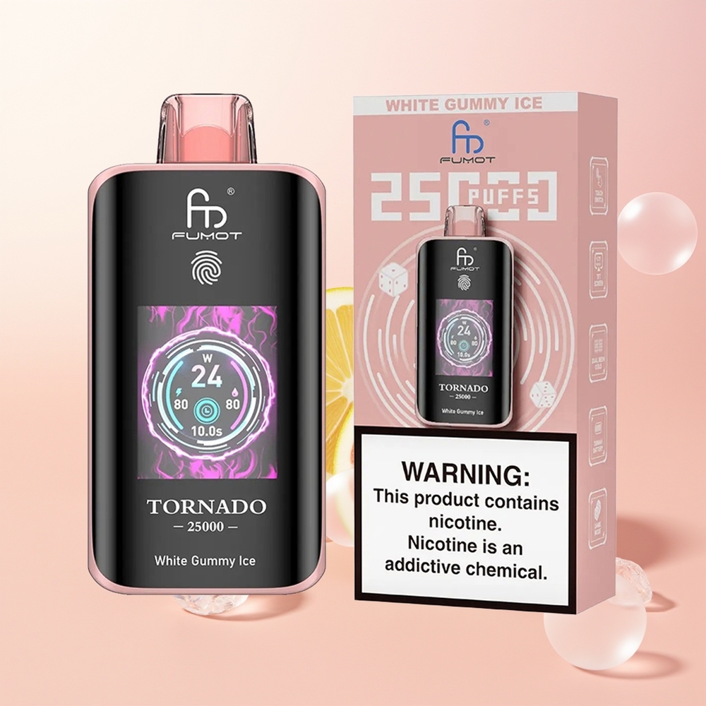 Fumot Tornado 25000 الجيمي الأبيض الجليدي مع شاشة عالية الدقة وبطارية قابلة للشحن