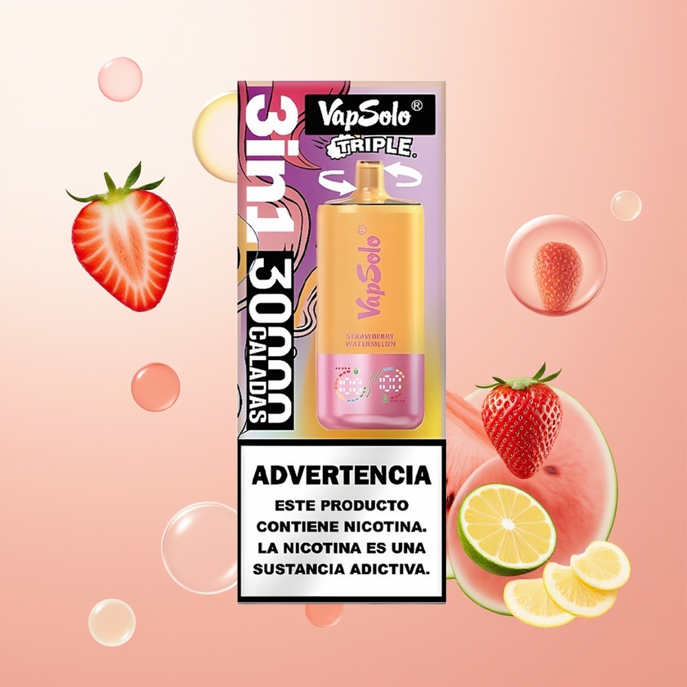 الرئيسية| الوافدون الجدد| VAPSOLO| Vapsolo Triple 30000| Vapsolo Triple 30000 فراولة بطيخ وليمون خوخ مع 40 مل و 3 خزانات